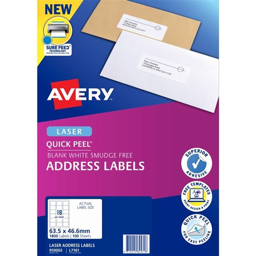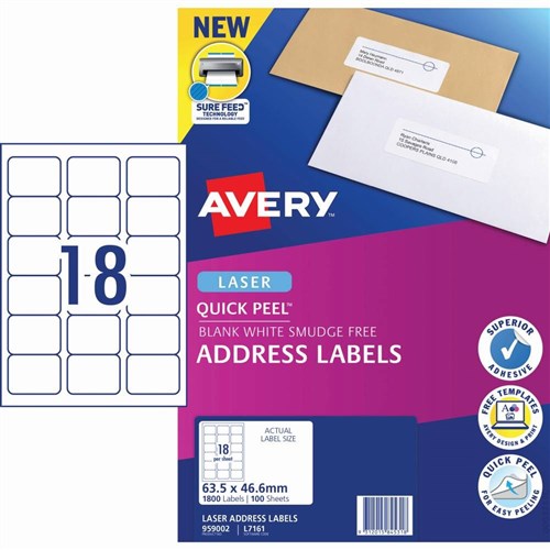 Avery Quick Peel Address Laser White L7161 63.5 x 46.6mm 18UP 1800 Labels 100 Sheets