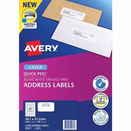 Avery Quick Peel Address Laser White L7651 38.1x21.2mm 65UP 6500 Labels 100 Sheets