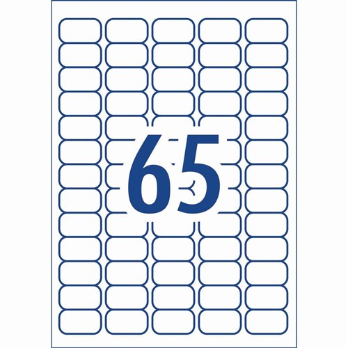• Size: 38.1x21.2mm 6500 labels, 100 sheets. 65 labels per sheet (65UP).